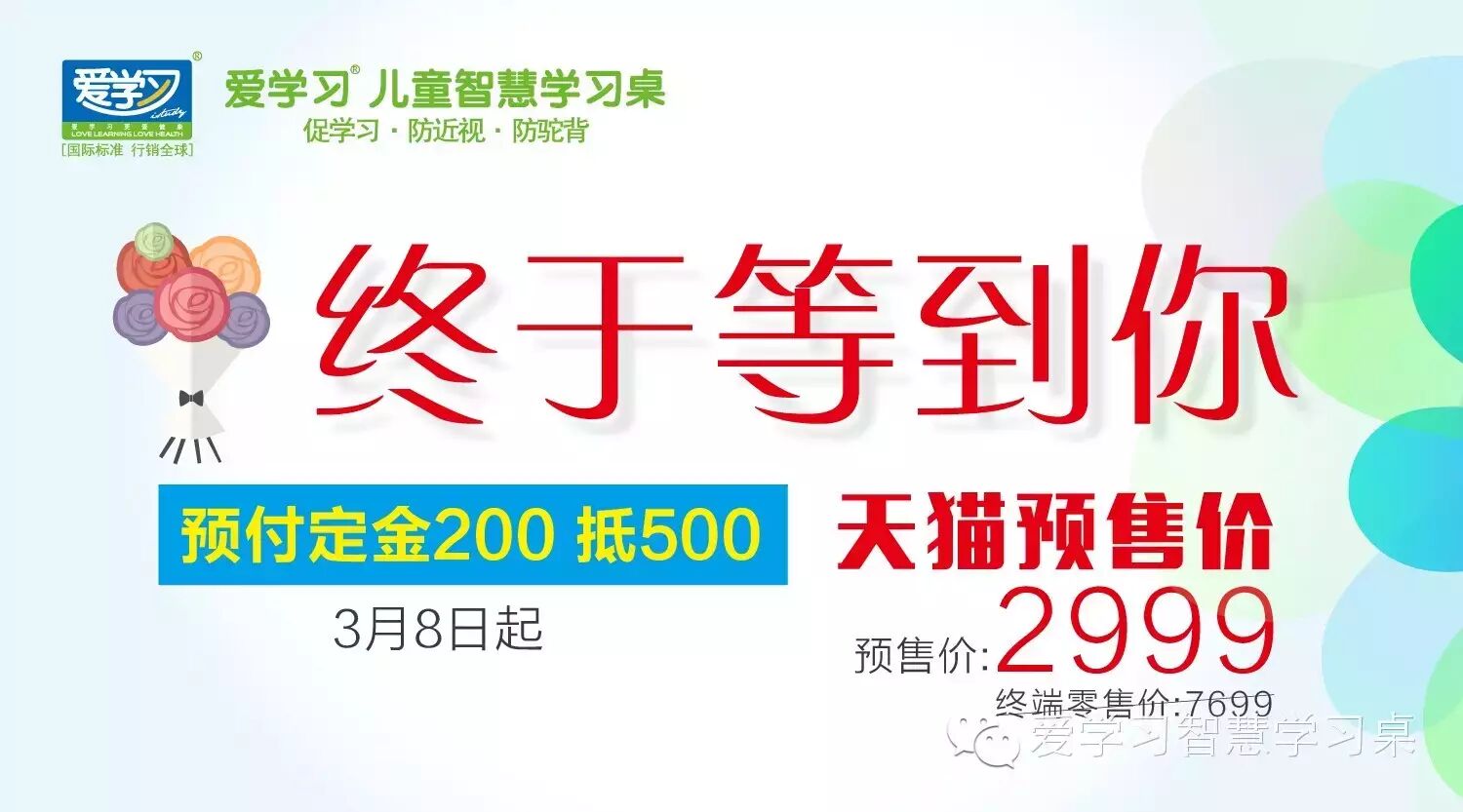 號(hào)外!號(hào)外! 愛學(xué)習(xí)天貓預(yù)售今天正式開始 介紹之前,容小愛高歌一曲,平復(fù)此刻的雞凍: 終于等到你 還好我沒放棄 愛學(xué)習(xí)天貓預(yù)售來得好不容易 才會(huì)讓人更加珍惜 終于等到你 差點(diǎn)要錯(cuò)過你 在比較好的女(fu)神(nv )節(jié)遇到愛學(xué)習(xí) 才算沒有辜負(fù)學(xué)習(xí)孩子 唱歌完畢,進(jìn)入主題 親愛的愛學(xué)習(xí)小伙伴,Ladies們! 你所期待的已經(jīng)到來 恰逢女神節(jié)到來 愛學(xué)習(xí)天貓預(yù)售也到來啦 愛學(xué)習(xí)2016全新創(chuàng)時(shí)代智慧學(xué)習(xí)桌椅 HYA-C120+HYY-C05 強(qiáng)強(qiáng)聯(lián)手,智慧全線升級(jí) 愛學(xué)習(xí)天貓預(yù)售 "值"此一次 吊牌價(jià):7699元 預(yù)售價(jià):2999元 預(yù)付定金200即刻抵扣500 購買套裝即送三大禮 ↑↑↑ ① 價(jià)值238元健康A(chǔ)7護(hù)眼燈 ②價(jià)值68元愛學(xué)習(xí)練字帖 ③價(jià)值38元智慧小書架 預(yù)售時(shí)間 預(yù)售:3月8日—4月7日 付尾款:4月8日—14日 發(fā)貨:4月10日—15日 小伙伴們,預(yù)售時(shí)間要記住哦! 不吹牛,不裝X 一套能用一輩子的 智慧學(xué)習(xí)桌椅 你所期待的 愛學(xué)習(xí),即刻為您呈現(xiàn)! 多種顏色,個(gè)性化滿足 全面貼合孩子健康成長(zhǎng) HYA-C120智慧桌:藍(lán)、粉、木紋 HYY-C05:藍(lán)、粉 更多愛學(xué)習(xí) 智慧桌椅組合預(yù)售內(nèi)容 即刻登陸愛學(xué)習(xí)天貓官方旗艦店 了解更多詳情 今天是國(guó)際三八婦女節(jié) 在這里 小愛也祝天下所有的美麗媽媽們 永遠(yuǎn)年輕漂亮 寶寶學(xué)習(xí)天天向上 健康快樂成長(zhǎng)