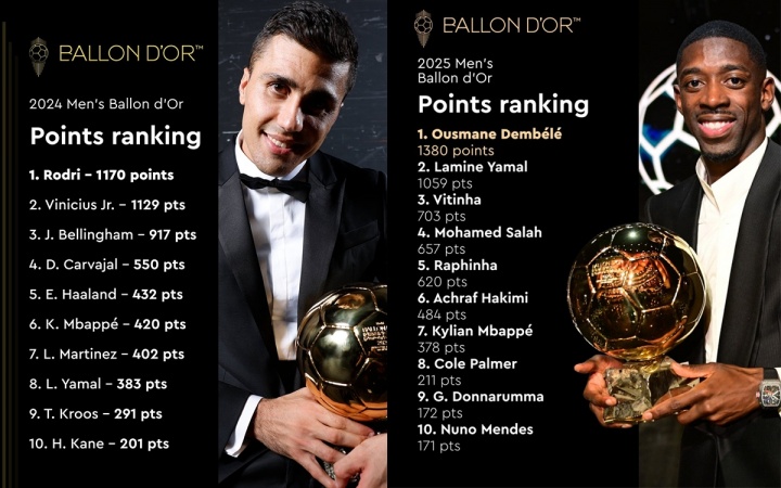 ??登貝萊得分領先亞馬爾321分,去年羅德里僅領先維尼修斯41分