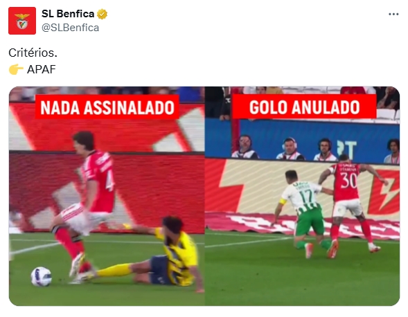 視頻中,左邊為本場比賽本菲卡丟球前對手疑似對安東尼奧-席爾瓦犯規的瞬間,配文“無事發生”,右邊為上場比賽本菲卡進球被吹前犯規的瞬間,配文“進球無效”。本菲卡官推還配文:“(判罰)標準?? APAF(葡萄牙裁判協會)”